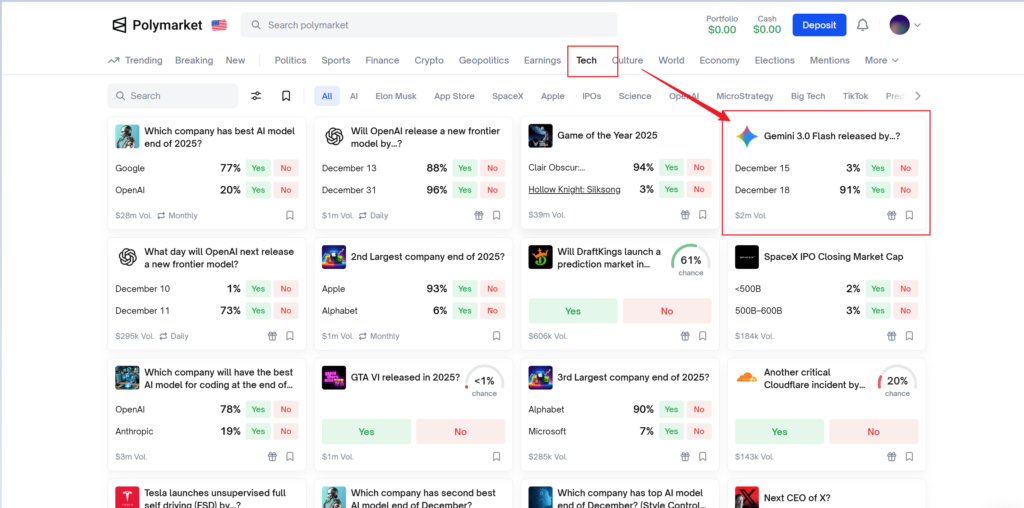 如上图所示,选择一个话题,比如Gemini 3.0 Flash是否在12月15日出来,投1注1美元,如果赢了的话会得到25美元的奖励。